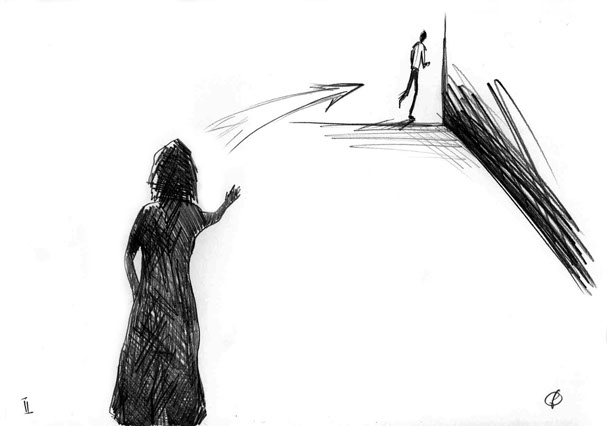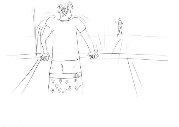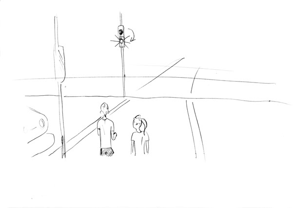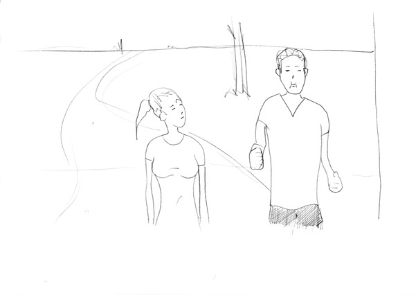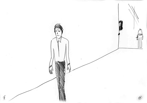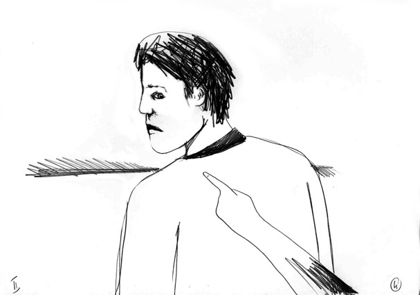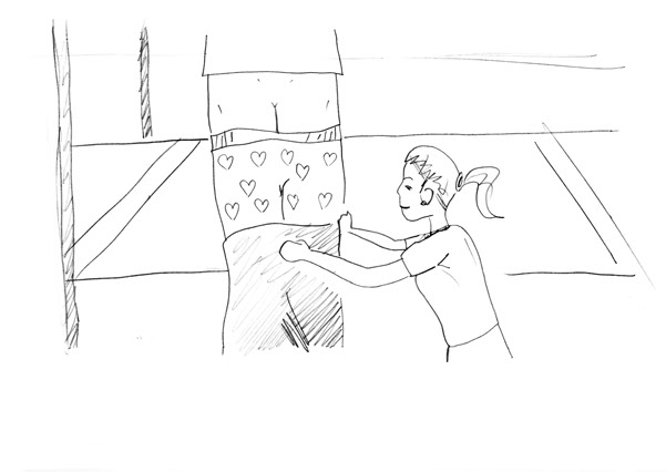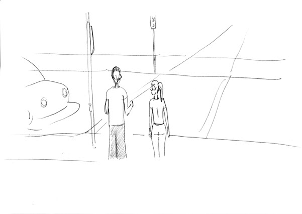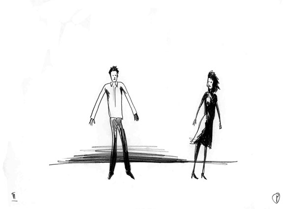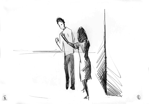 … says: "You're it!". As she is done, she walks away with a smile, leaving the confused man behind.